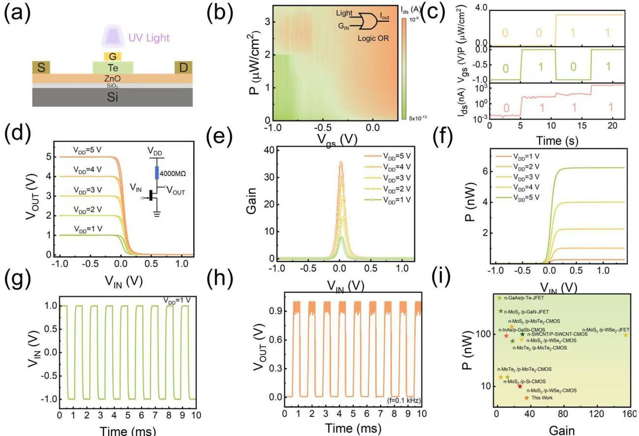 图5.逻辑应用(a)-(b) 375纳米光照下ZnO/Te结型场效应晶体管的结构示意图及电流分布。(c)不同输入逻辑状态下的或门输出特性曲线随时间变化。(d)由ZnO/Te结型场效应晶体管与4000Ω外部电阻组成的反相器(插图电路)在VDD = 1-5 V供电电压下的VOUT-VIN特性曲线。(e)不同VDD电平下的增益表现。(f)不同VDD 条件下的P值变化。(h)在VDD = 1 V条件下,采用100 Hz方波输入1 V和0 V信号时,从(g)图获得的动态输出电压响应。(i)其他结型场效应晶体管的增益与p值对比图表