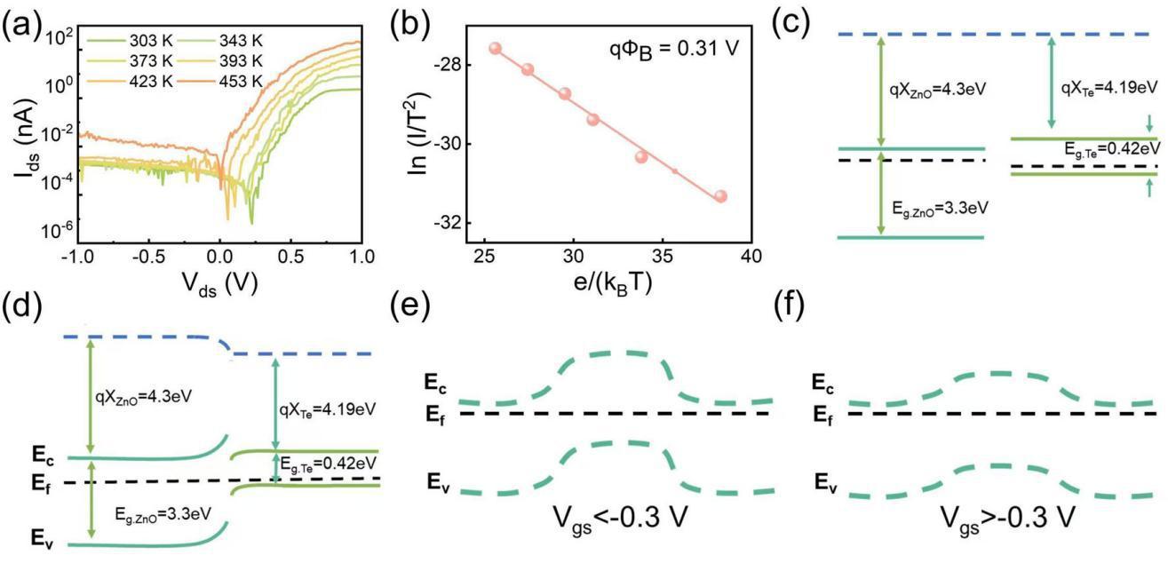 图4.能带机制分析。(a)ZnO/Te结型场效应晶体管在303至453 K温度范围内的温度依赖性I-V曲线。(b)ln(I/T2)与e/(kBT)的理查森图,势垒参数qΦB(~0.31 eV)由线性拟合斜率确定。(c)-(d)氧化锌与碲界面接触前后的能带对齐情况。II型ZnO/Te异质结的能带图示:(e)栅源电压Vgs < -0.3 V时;(f)栅源电压Vgs > -0.3 V时