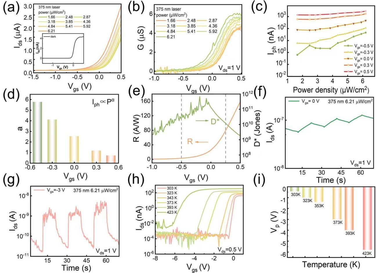 图3. ZnO/Te结型场效应晶体管的光电探测特性。(a)ZnO/Te结场效应晶体管在375 nm激光照射及暗态条件下的转移曲线。(b)ZnO/Te结场效应晶体管在375 nm激光照射下,其光电流密度Gm随栅源电压Vgs的变化关系。(c)不同栅源电压下光电流随光功率密度的变化关系. (d)指数α函数对Vgs进行拟合。(e)375 nm紫外光照射下由栅源电压Vgs调制的探测效率与响应度。(f)-(g)ZnO/Te结场效应晶体管在375 nm紫外光照射下,栅源电压-Vgs=-3 V和0 V时的电流-时间曲线。(h)ZnO/Te结场效应晶体管转移特性随温度变化的测量结果。(i)随温度从303升至423 K时,转移曲线的击穿电压(Vp)变化情况