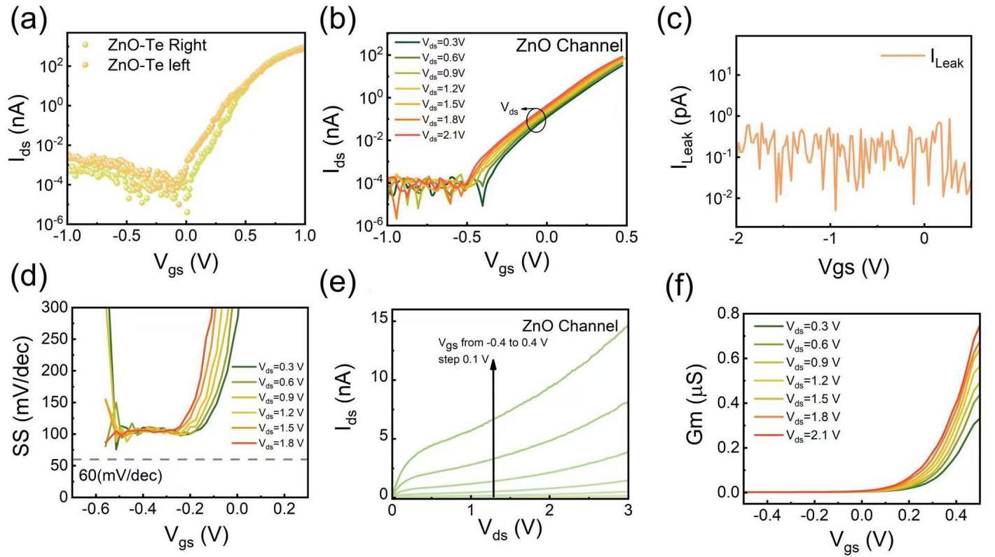 图2. ZnO/Te结型场效应晶体管的电学特性。(a)左右两侧ZnO/Te异质结的对数坐标Ids-Vds曲线。(b)Vds电压从0.3 V到2.1 V范围内的转移特性曲线。(c)ZnO/Te结型场效应晶体管的栅极漏电流。(d)ZnO/Te结型场效应晶体管的亚阈值摆幅(SS)随Vgs变化的函数关系。(e)ZnO/Te结型场效应晶体管在-0.4至0.4 V Vgs下的输出特性曲线。(f)转导系数(Gm)随Vgs变化的函数关系