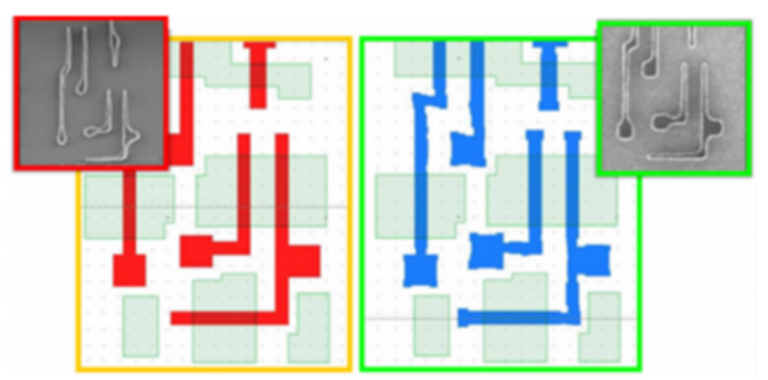 (左)典型的光学邻近效应图形(右)通过光学邻近校正后的图形
