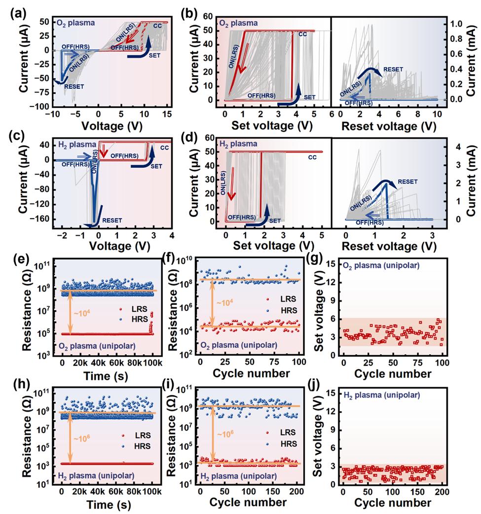 图2 等离子体气体类型与剂量对忆阻性能的调控。在3 W功率、3 s处理时间的氧等离子体作用下,忆阻器伏安特性曲线的循环耐久性测试:(a)电极制备后处理;(b)电极制备前处理。在3 W功率的氢等离子体、电极制备前处理条件下,忆阻器伏安特性曲线的循环耐久性测试:(c)处理时间6 s;(d)处理时间9 s。(e-g)分别为氧等离子体处理的单极忆阻器的电阻状态保持时间,开关比分布,开启电压分布。(h-j)分别为氢等离子体处理的单极忆阻器的电阻状态保持时间,开关比分布,开启电压分布。