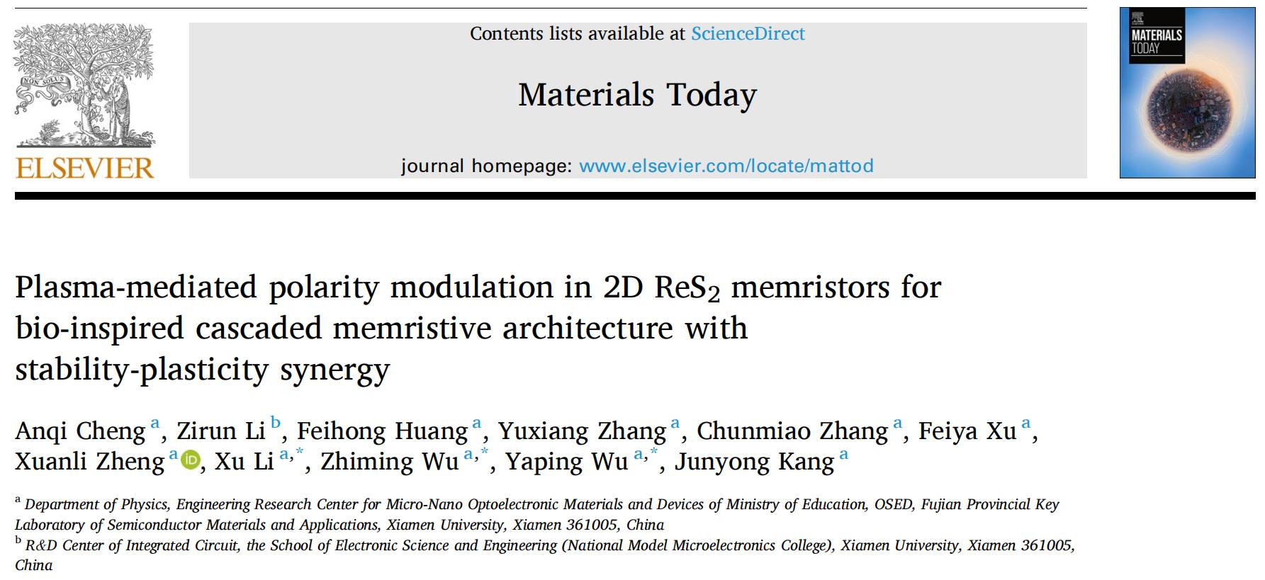 厦门大学物理系的吴雅苹教授课题组在忆阻器领域研究中取得最新进展,该研究成果以“Plasma-mediated polarity modulation in 2D ReS2 memristors for bio-inspired cascaded memristive architecture with stability-plasticity synergy”为题发表在《Materials Today》上。
