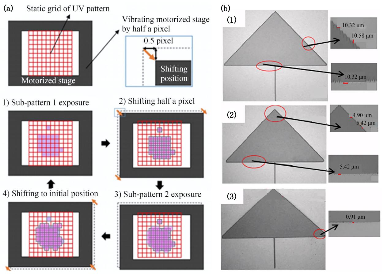 图(b)展示了扫描式光刻结合摆动光刻技术,其中图(2)和图(3)分别是通过叠加1/2个像素和叠加1/4个像素得到的锯齿尺寸,进一步验证了DMD子图错位扫描叠加光刻对于减小光刻微结构边缘锯齿的有效性,并证明移动更小的像素(1/4个像素)重叠能得到更好的边缘平滑度。