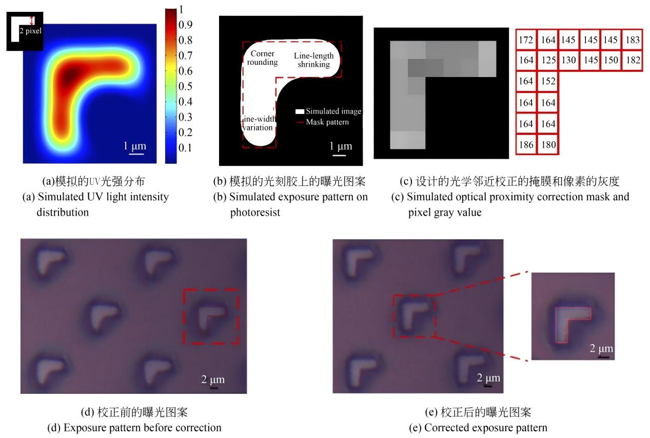 效果验证:通过实际曝光验证,与传统二进制掩模的结果(图(d))相比,应用此灰度校正方法得到的图形(图(e))与原始设计图案的一致性显著提高,有效修正了光学邻近效应带来的图形缺陷。