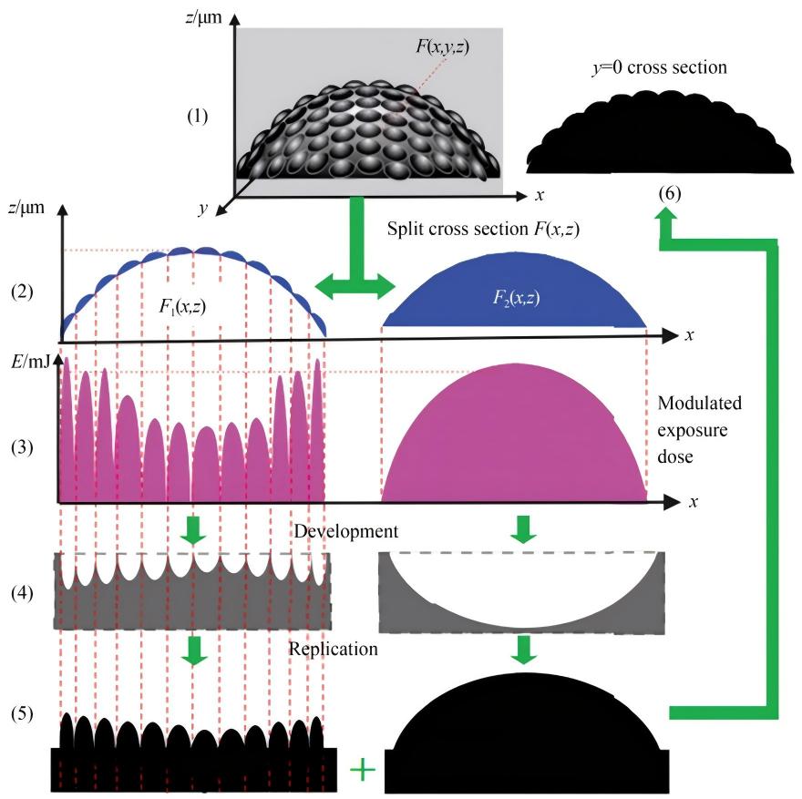 双灰度DMD无掩模光刻技术,将目标曝光剂量分布分解为两个互补的三维能量分布图,通过两次灰度曝光叠加,相当于扩展了有效的灰度级数,能够实现更精细、更平滑的剂量控制,在球形表面上成功制造出光学平滑度更高的曲面微透镜阵列,克服了单次灰度调制的局限性。