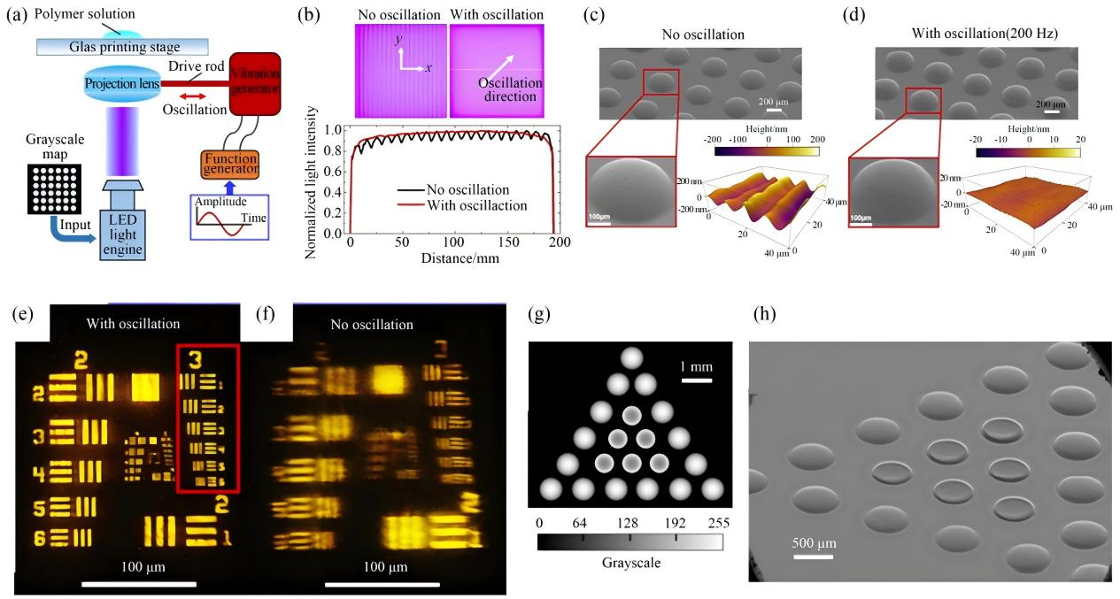 此外,振动辅助灰度光刻技术,通过在曝光时使投影透镜沿对角线方向振荡,有效消除了因DMD微镜间隙导致的光强波动。它没有从复杂且昂贵的光学或DMD芯片本身入手,而是通过一个简单的机械振动模块,将空间上的光强不均匀性问题,转化为时间域上可被平均掉的噪声,从而以极低的成本显著提升了成品的表面质量(粗糙度低至1 nm)和光学性能。