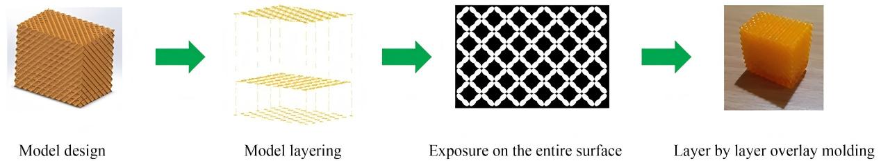 其原理为,先设计三维模型的CAD,再将模型转为一系列二维位图文件。每个位图文件输入DMD,DMD作为动态掩模对光敏树脂进行选择性曝光,固化一层后,工作台移动一层高度,如此逐层叠加,最终成型一个完整的三维实体。