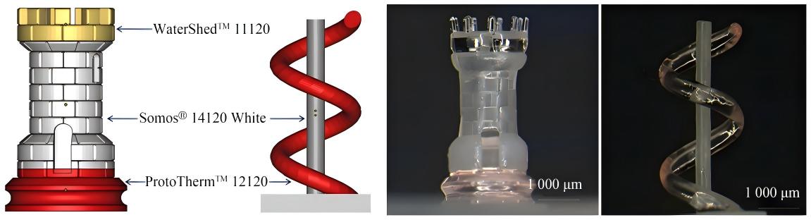 如下图所示,研究人员成功打印出由两种和三种不同材料构成的复杂三维模型,实现了在微观尺度上集成多种功能特性,极大地拓展了在组织工程、生物医学等领域的应用潜力。
