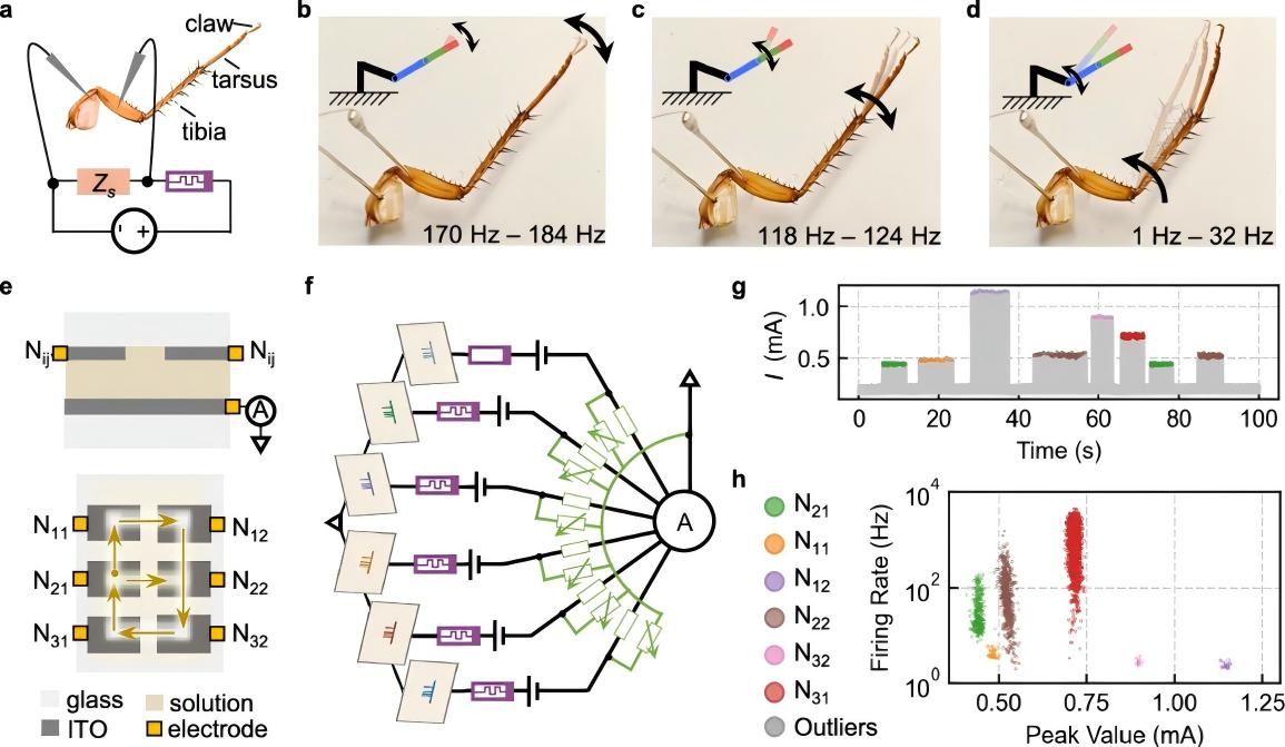 研究进一步展示了HAN在生物‐电子接口和模式识别中的应用。通过连接蟑螂腿运动神经,团队构建出混合反射弧,通过调节尖峰频率可激发不同的肌肉运动模式。此外,将多个HAN组成传感阵列,实现了基于指尖温度感知的手写数字轨迹识别。