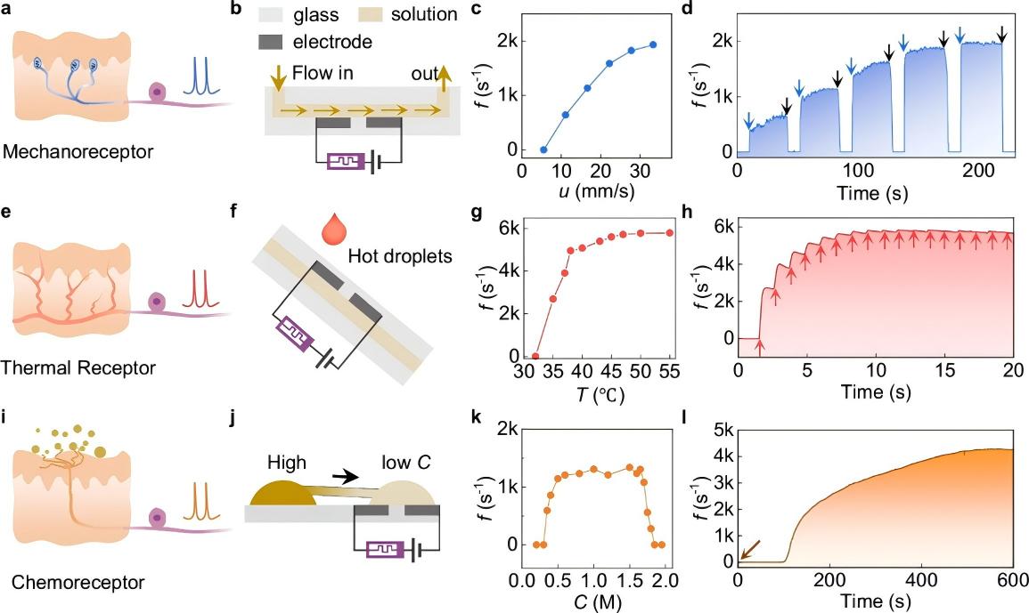 得益于离子行为对环境变化的高度敏感性,该器件表现出优异的多模态感知能力。无需额外集成传感单元,HAN即可直接响应流速、温度和离子浓度等多种物理化学刺激,展现出丰富的频率响应行为。研究团队利用这一特性,成功模拟出机械感觉、热感觉和化学感觉神经元的基本功能,实现了从环境信号到脉冲频率的直接编码转换。