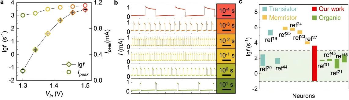 图2. HAN的频率可调范围(a-b)及与生物神经元和其他类型人工神经元的对比(c)。