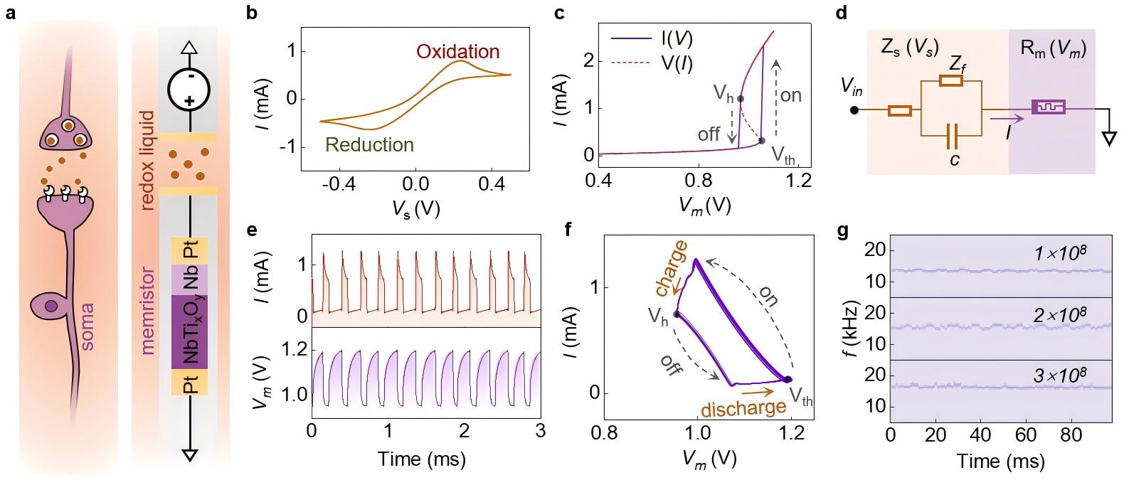 该器件的设计灵感源于生物神经元的工作机制(图1a)。其电子部分基于Nb/NbTixOy忆阻器,具有类似生物神经元中离子通道的阈值开关特性,起到类似胞体的功能;离子部分则采用含Fe2+/Fe3+氧化还原对的电化学单元,通过低电位下的可逆反应(图1b),模拟突触间神经递质的释放与接收,实现了离子与电子信号的高效转换。两者结合形成的等效电路(图1d),可在输入电压激活后产生类神经脉冲(图1e),并展现出优异的稳定性——在超过3亿次脉冲循环中保持频率高度一致(图1g),具备长期可靠的神经形态处理能力。