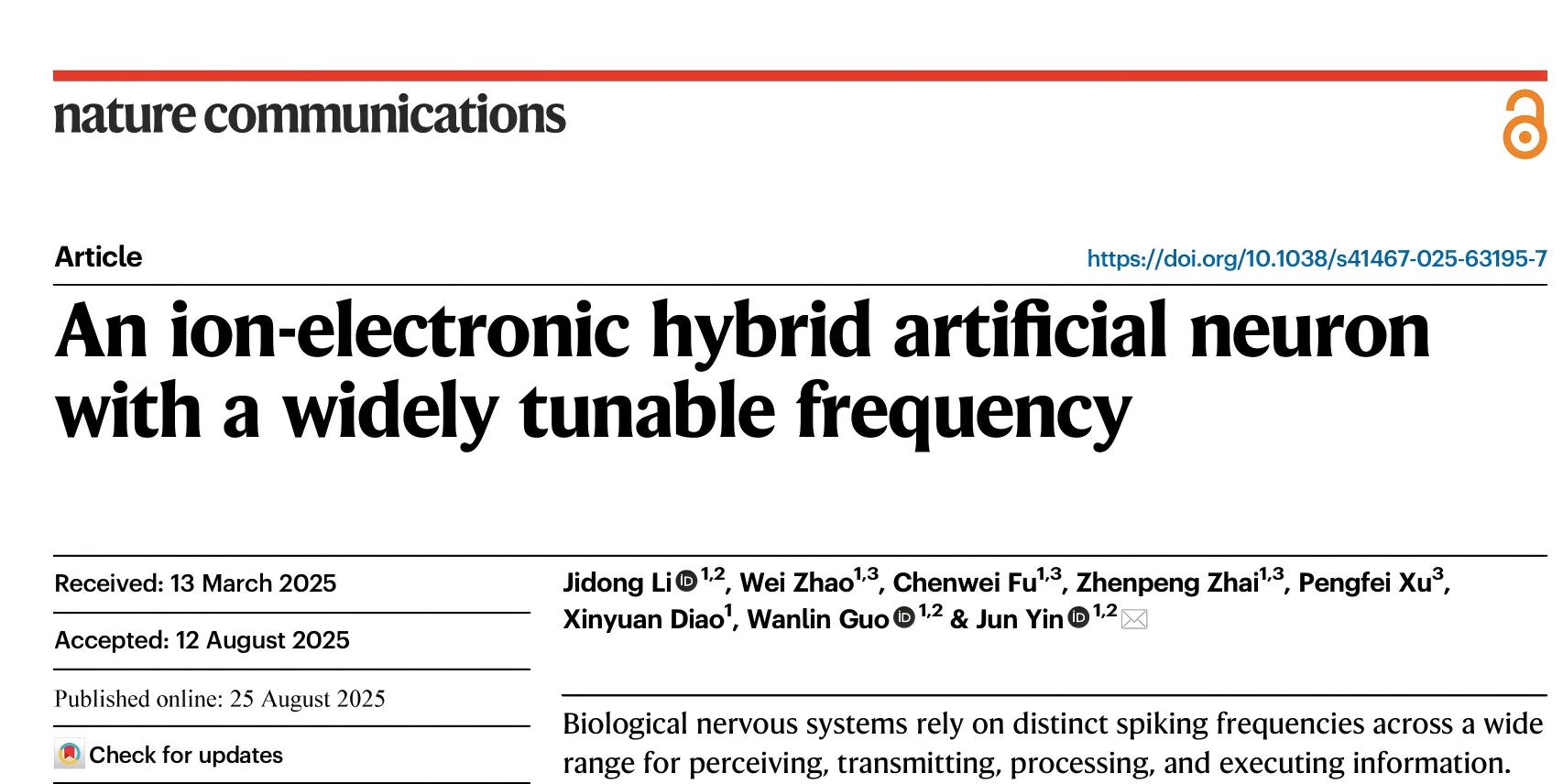 客户成果丨南京航空航天大学《Nature communications》:离子-电子混合人工神经元实现宽频率调控