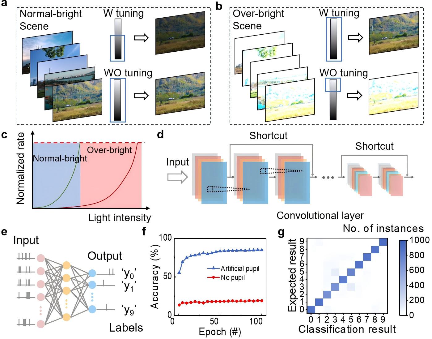 图4.自适应脉冲视觉神经元与脉冲神经网络(SNN)的集成应用。a) 和b) 展示了自适应与非自适应脉冲视觉神经元在感知不同光照环境时的对比效果。c) 正常光照/过量光照条件下,自适应/非自适应神经元的光强-脉冲频率响应曲线。d) 卷积脉冲神经网络(CSNN)模型中的多级残差块结构。e) 全连接层输出的10个分类结果,其中‘y0’至‘y9’代表不同类别。f) 经过100个训练周期后,自适应与非自适应脉冲神经元的准确率对比。g) 自适应脉冲神经元分类结果的混淆矩阵分析。