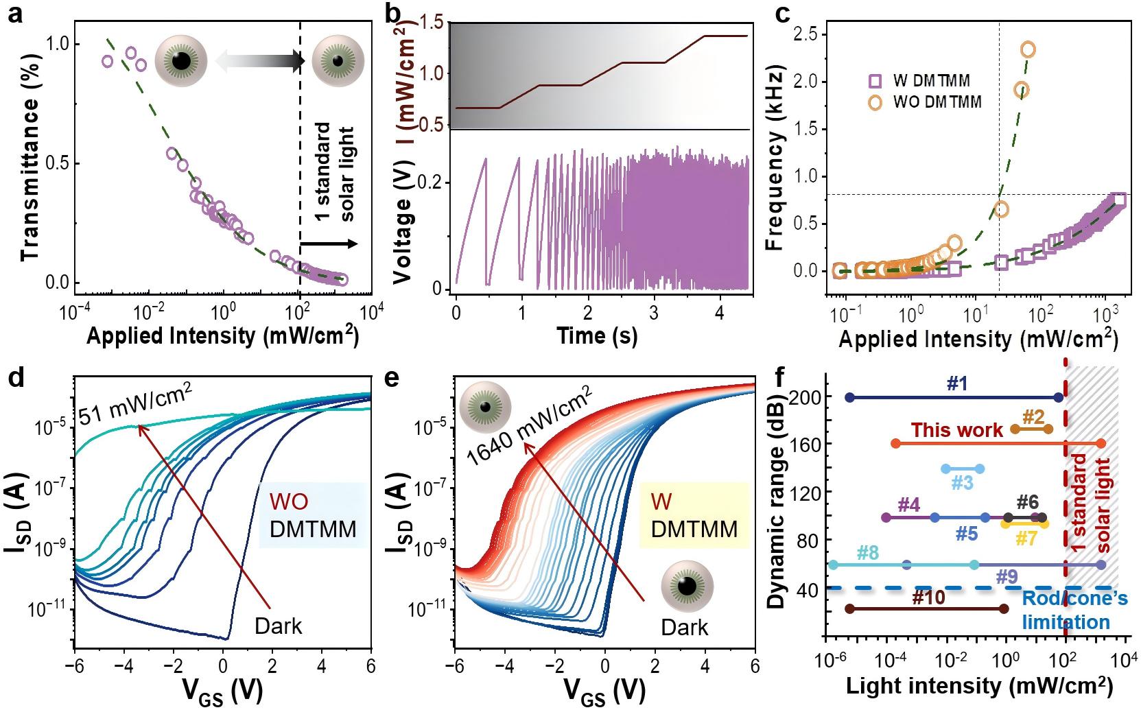 图3.自适应脉冲视觉神经元的特性分析。a) DMTMM光致变色膜的透射率-光强度关系曲线。b) 1T1M结构中脉冲编码频率对不同光照强度的动态响应。c) 带/不带DMTM膜的1T1M结构光编码频率对比。d) 和e)分别为1T1M结构中IGCdO感光细胞在带/不带DMTM膜时的操作光强度范围。f) 生物启发式自适应视觉系统在操作光强度范围与动态范围的对比分析。