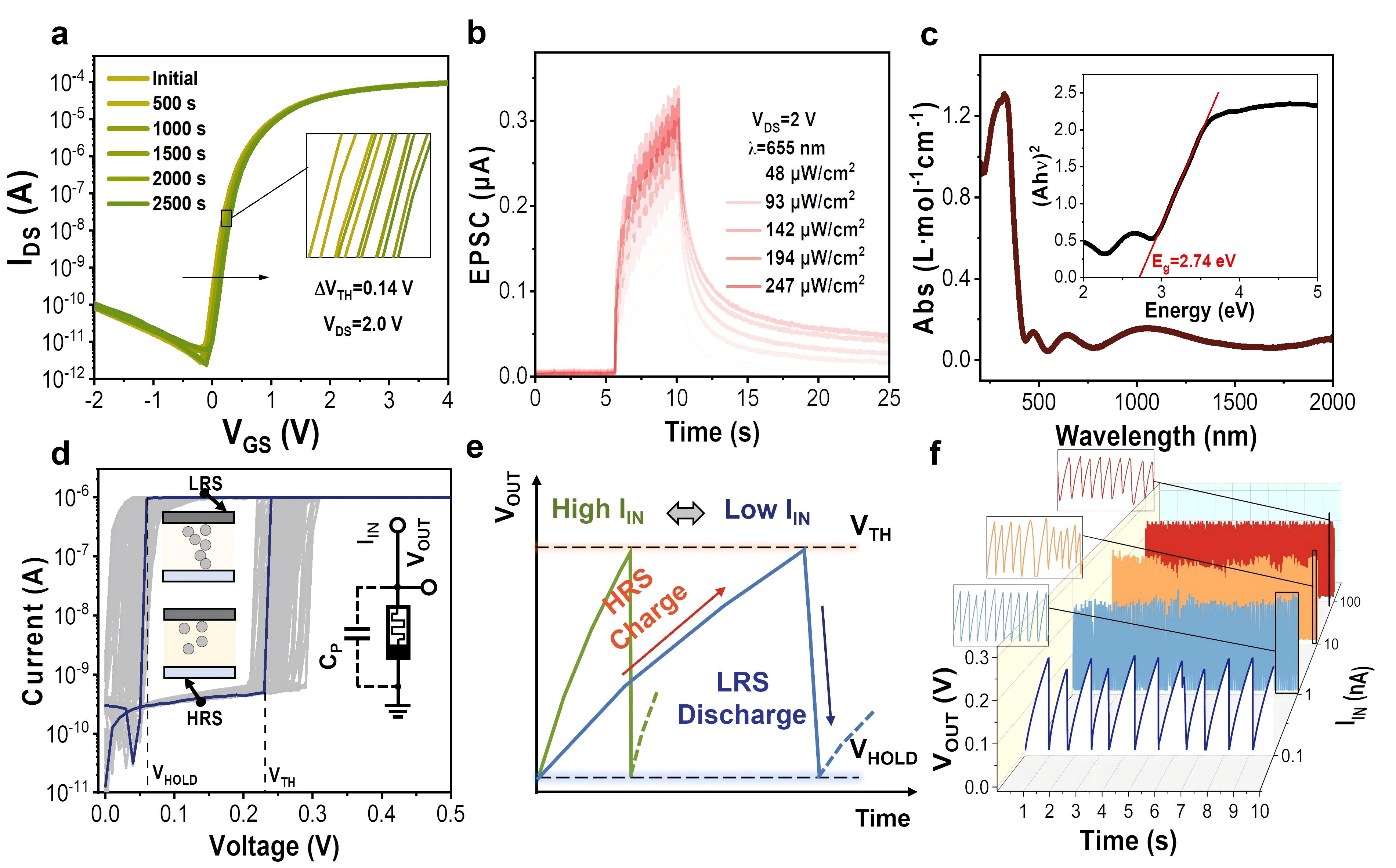 图2. IGCdO基晶体管与TaOX基忆阻器在1T1M结构中的特性研究。a) 室温下IGCd氧化物基晶体管在正偏压应力(PBS)下的转移特性曲线。b ) IGCdO氧化物基晶体管在不同强度655 nm光源下的光响应特性。c) IGCdO氧化物沟道层的光学吸收光谱(200-2000 nm)。d) TaOX基忆阻器在1 μA合规电流下连续200次循环的电阻切换(RS)曲线。e) TaOX基忆阻器的脉冲编码机制。f) TaOX基忆阻器在10秒持续电流输入下,0.1、1、10和100 nA电流下的脉冲输出特性。