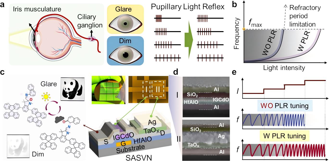 图1.受瞳孔光反射启发的自适应脉冲视觉神经元。a) 瞳孔光反射机制及其在视觉编码中的重要作用;b) 光瞳反射对生物编码频率的限制及视觉适应范围的扩展;c) 自适应脉冲视觉神经元结构与光学成像,以及DMTMM薄膜的光致变色原理。区域I和II分别对应基于IGCdO的晶体管和基于TaOX的忆阻器;d) 图c中器件I区和Ⅱ区的横截面图像;e) 瞳孔光反射功能为增强仿生视觉系统的视觉性能提供了极具潜力的解决方案。