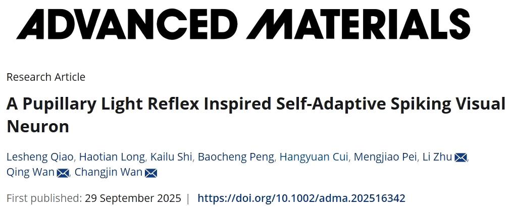 视觉系统承载着人脑80%以上的信息输入,其高效、自适应的光感知能力一直是机器视觉领域追求的目标。然而,现有的人工视觉系统多采用振幅调制信号,依赖被动栅电压调控扩大感知范围,不仅生物仿生程度低,且能耗高、速度慢、适应性差。对此,南京大学电子科学与工程学院的万昌锦教授团队受生物瞳孔光反射(Pupillary Light Reflex, PLR)机制启发,成功研制出一种自适应脉冲视觉神经元(SASVN),该成果以“A Pupillary Light Reflex Inspired Self-Adaptive Spiking Visual Neuron”为题,发表于国际顶级期刊《Advanced Materials》上。