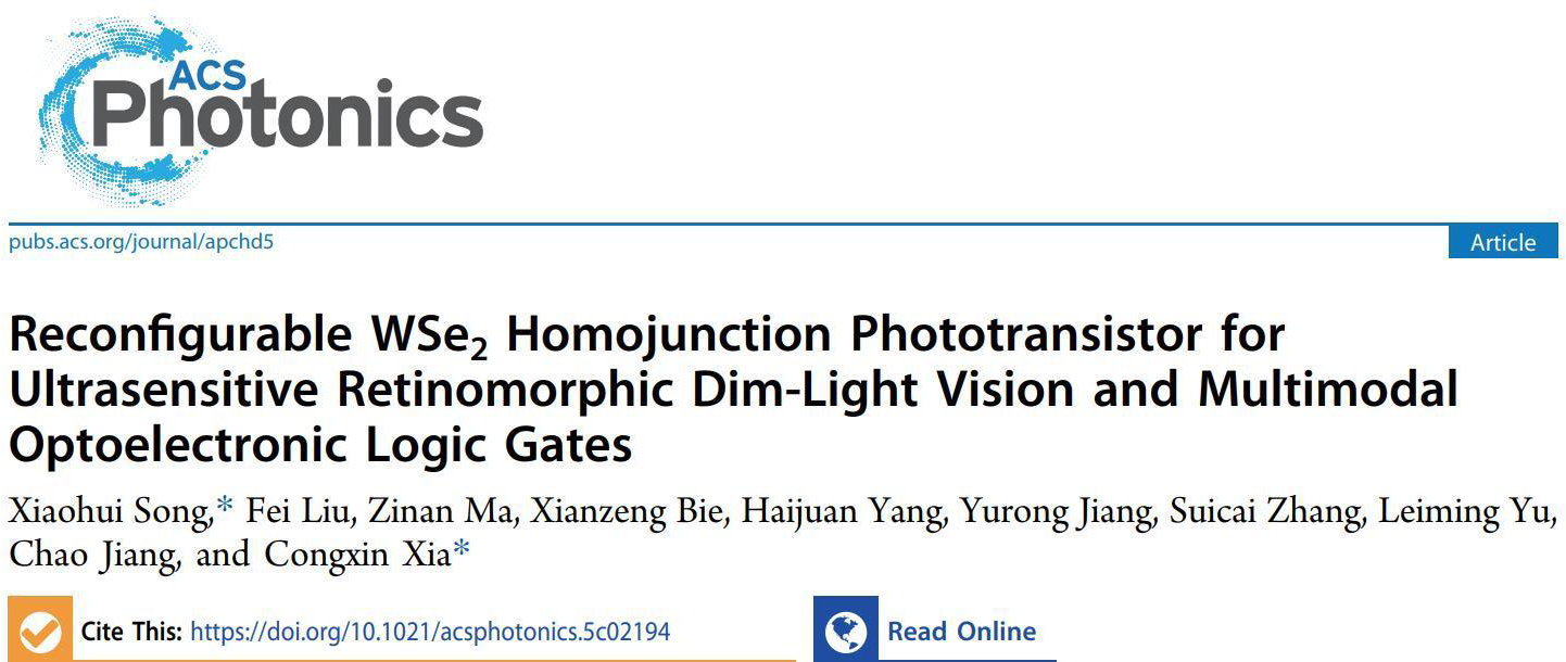 高效、自适应的光感知能力一直是机器视觉领域追求的目标。然而,现有的人工视觉系统多采用被动栅压调控或固定响应模式,依赖外部电路实现感知范围扩展,不仅生物仿生程度低,且存在能耗高、响应速度慢、环境适应性差等问题。对此,河南师范大学物理学院的夏从新教授团队受视网膜双极细胞拮抗处理机制启发,成功研制出一种可重构WSe2同质结光电晶体管,实现了超灵敏弱光视觉与多模态光电逻辑门功能,该成果以“Reconfigurable WSe2 Homojunction Phototransistor for Ultrasensitive Retinomorphic Dim-Light Vision and Multimodal Optoelectronic Logic Gates”为题,发表于国际权威期刊《ACS Photonics》上。
