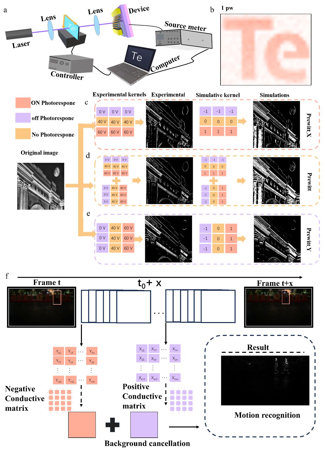 图4. (a) 基于WSe2/MoO3器件、在405 nm激光照射下的单像素成像系统示意图。(b) 在超低功率405 nm激光照射下重建的"Te"掩模图像。(c) Prewitt-x边缘检测结果。(d) 基于Prewitt算子的多方向边缘融合处理结果。(e) Prewitt-y边缘检测结果。不同卷积运算的实验结果与使用标准卷积核获得的模拟结果进行对比。(f) 利用双向光伏效应进行运动目标检测的处理过程与机制解析。