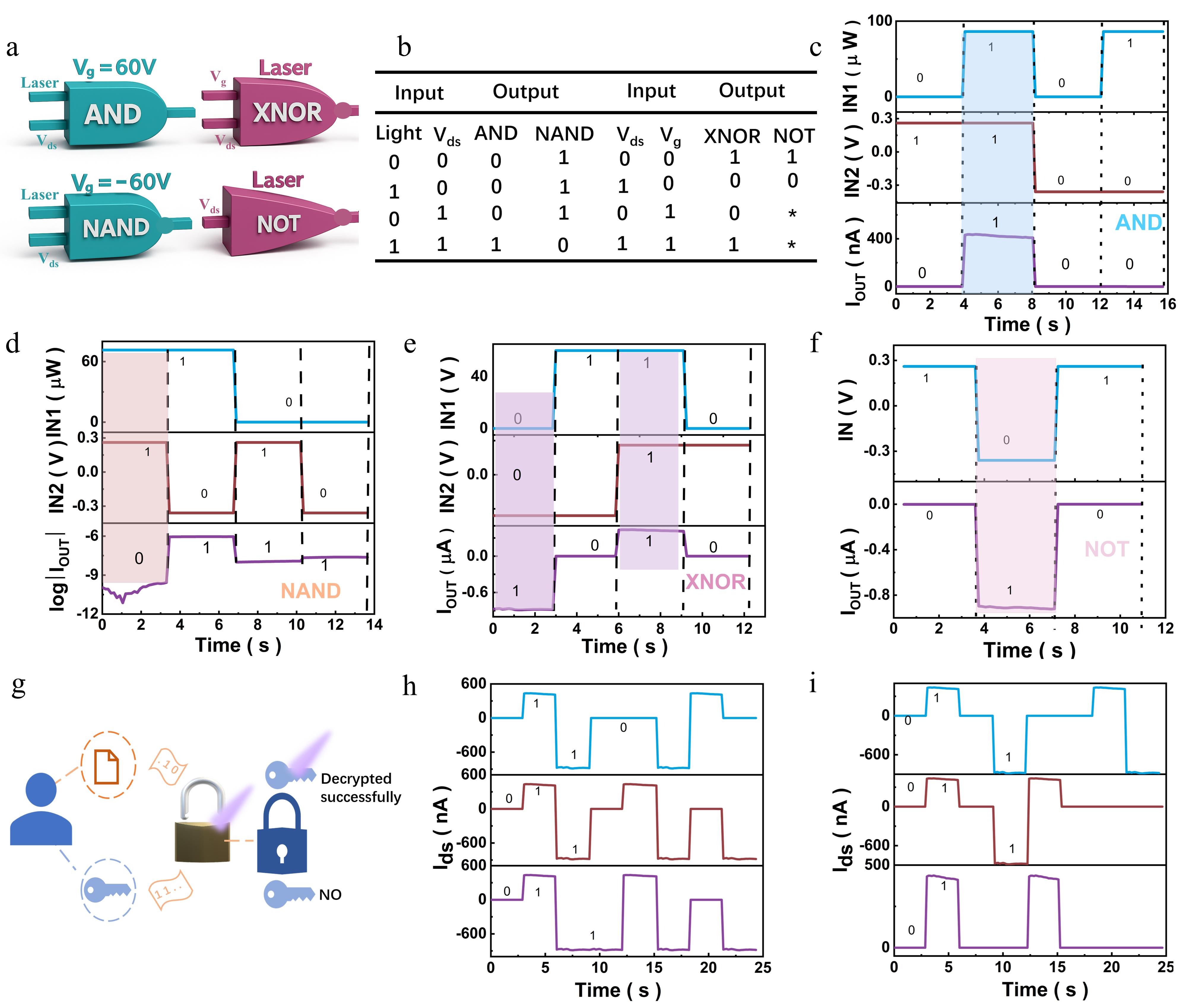 器件不仅可作为高灵敏度视觉传感器,还可通过栅压、偏压与光输入的多参数调控,在单一器件内实现AND、NAND、XNOR、NOT等多种可重构逻辑功能,并构建双层加密光通信系统。