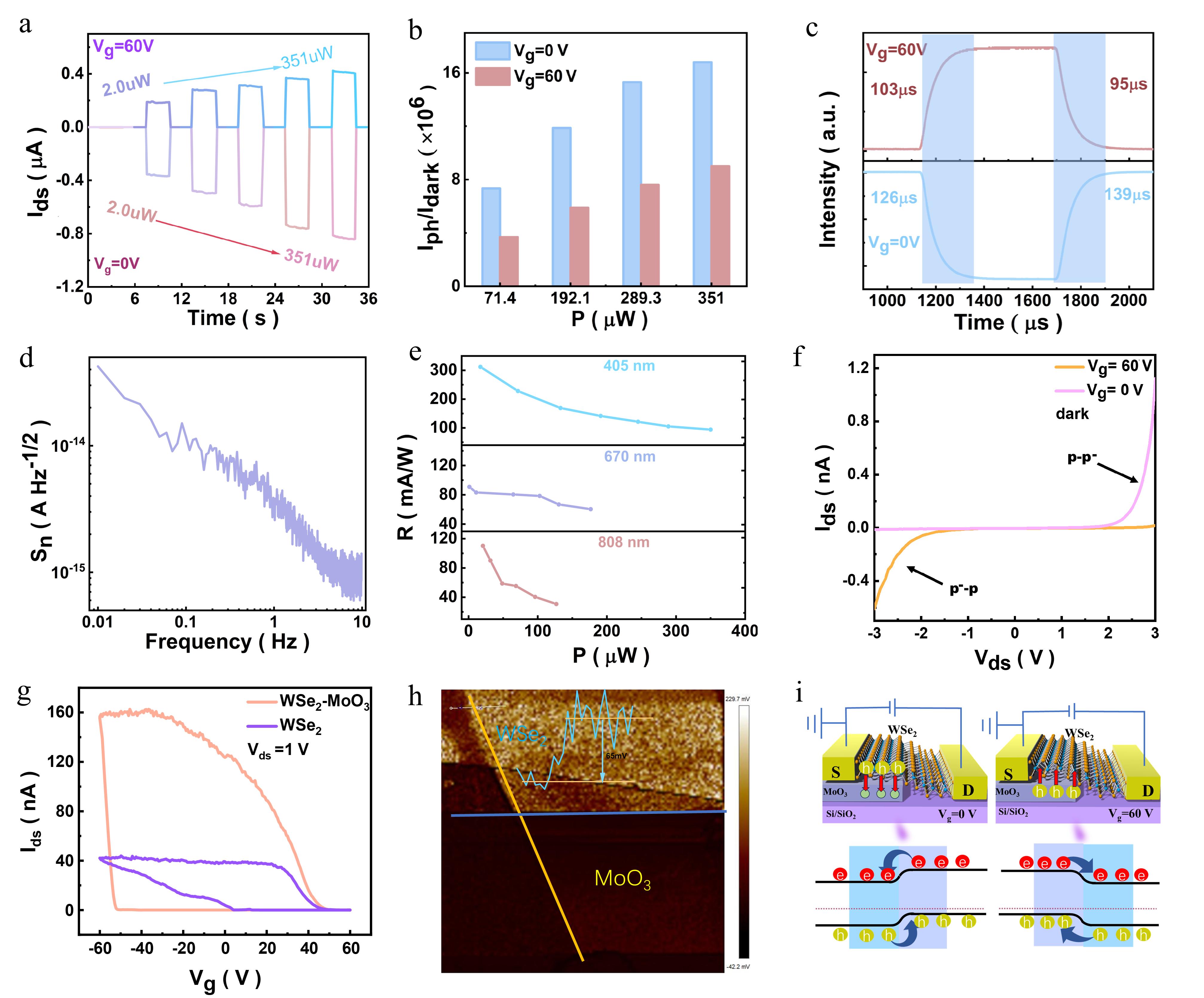 图2. WSe2/MoO3器件的光电测量。 (a) 器件在激光调制(405 nm, 0.8-351 μW, Vd = 0 V, Vg= 0 和 60 V)下的明暗电流比和 (b) 短路电流动态响应。(c) 在Vd=0 V, Vg=0 V 和 60 V下测量的时间分辨光响应。(d) 在Vd=0 V, Vg=0 V下记录的器件噪声谱密度。(e) 在Vd=0 V, Vg=0 V, 405 nm光照下与功率相关的响应率。(f) 在Vg=0 V 和 60 V的黑暗条件下,WSe2/MoO3器件的Id-Vd曲线(Vd从-3 V扫描到3 V)。(g) 在黑暗条件下(Vd=1 V),单个WSe2晶体管和WSe2/MoO3晶体管在双扫测量下的转移特性曲线。(h) WSe2/MoO3异质结区域的开尔文探针力显微镜图像和表面电势分布图。(i) 解释正、负光伏效应的工作机制与能带结构示意图。