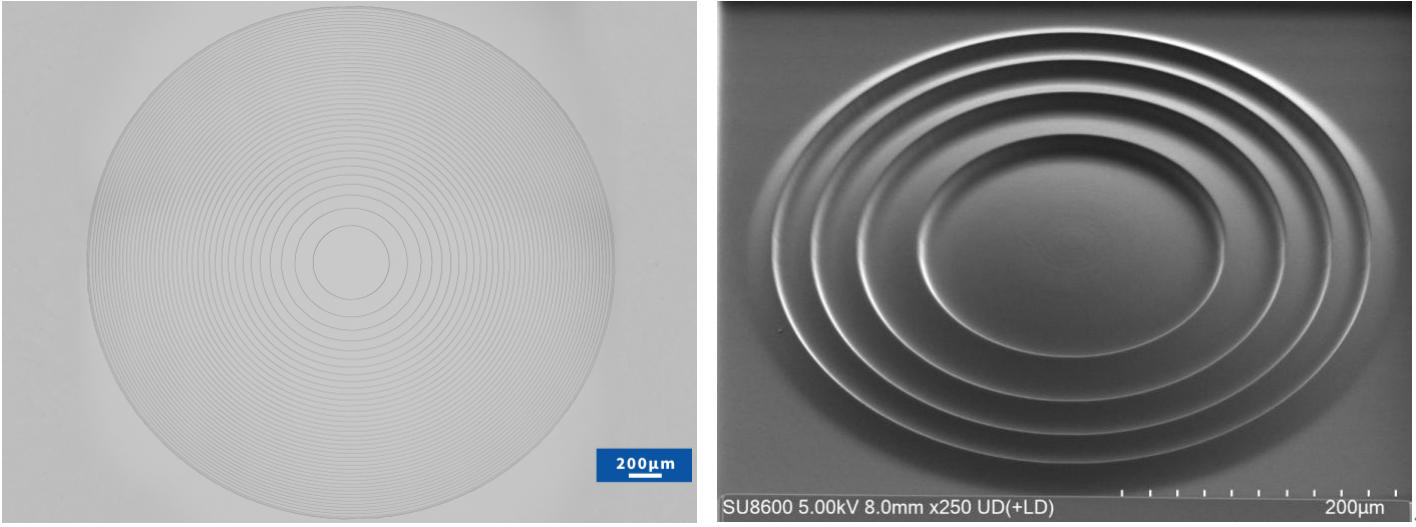 托托科技的无掩模版紫外光刻设备,能够无需掩模直接生成连续或阶梯状的环带立体结构,尤其擅长实现环带边缘的平滑过渡与精确深度控制,是实现高精度、轻薄化菲涅尔透镜的理想技术。