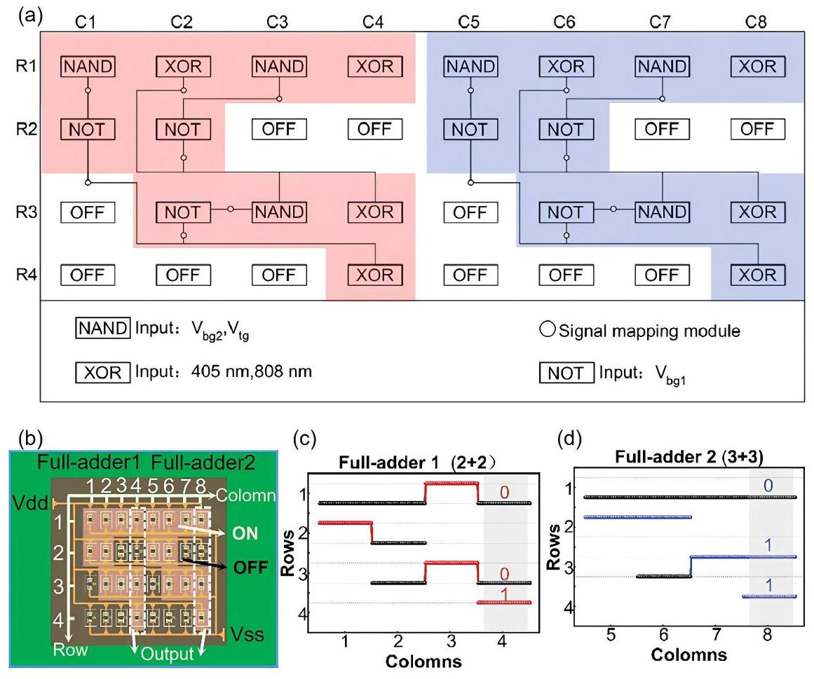 图3 4×8 FPGA内部两个独立的2位全加器。(a) 在4×8 FPGA中构建两个2位独立全加器的完整逻辑门连接电路。红色与蓝色阴影区域代表处于工作状态用于构建加法器的器件阵列,非阴影区域代表未参与运算的器件。输入信号Vbg2对应VG2,Vtg对应VG1,Vbg1对应VG4。(b) FPGA印刷电路板实物图展示。(c) 全加器1计算(1,1) + (1,1) = (1,1,0)的过程演示。(d) 全加器2计算(1,1) + (1,1) = (1,1,0)的过程演示。