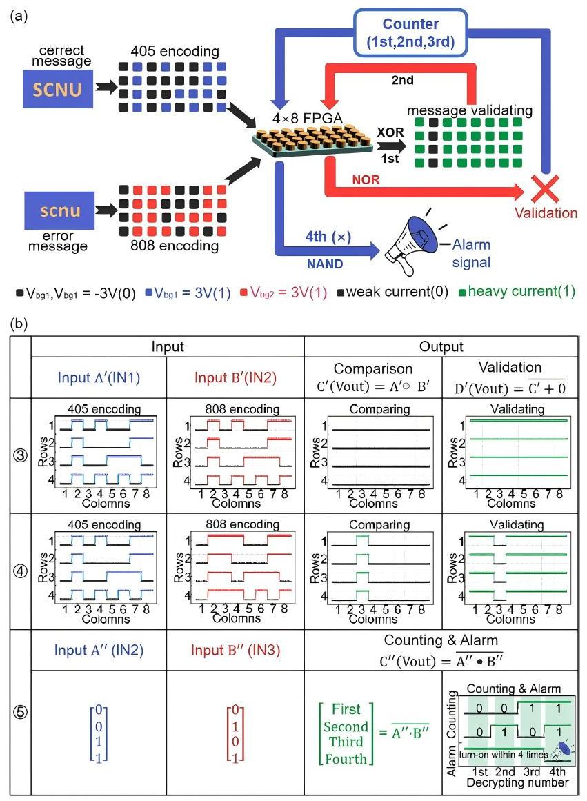 此外,研究基于多区域栅p-MoTe2晶体管设计了4×8 FPGA,构建了一个在多用户之间传递信息的安全通信系统。其中,用户信息以标准ASCII代码为对照,通过编解码过程生成405和808的无符号8位二进制光信息矩阵,再与用户自定义密钥矩阵通过XOR计算进行信息加密与解密。所得信息正确与否通过NOR计算进行验证,验证结果进而通过NAND计算触发警报。以上信息加密/解密和验证报警的信号处理过程都在同一器件单元中完成,同时团队也从通信安全应用方面证明了器件的系统级联可行性。