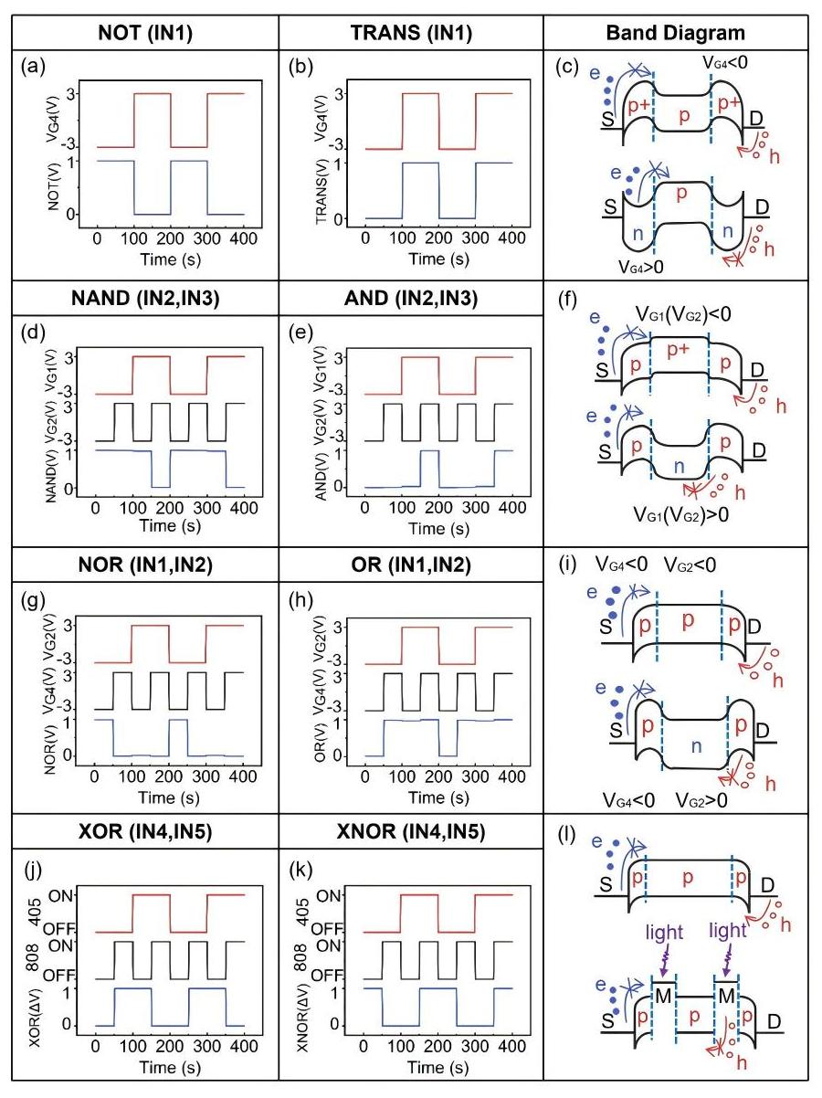 图1 全逻辑门器件逻辑功能的具体实现与控制原理。NOT为仅由VG4调控的单输入单输出逻辑门:(a-c) NOT与TRANS的电压输出曲线及能带示意图。与非门(NAND)为VG1与VG2同步调控的双输入单输出逻辑门:(d-f) NAND与AND的电压输出曲线及能带示意图。NOR为VG2与VG4同步调控的双输入单输出逻辑门:(g-i) NOR与OR的电压输出曲线及能带示意图。XOR为405 nm与808 nm激光信号同步调控的双输入单输出逻辑门:(j-l) XOR与XNOR的电压输出曲线及能带示意图。