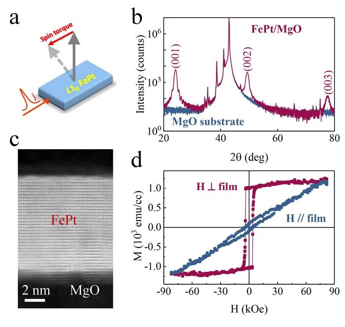 为解决这些根本性瓶颈问题,作者创新地提出在兼具强磁性和强自旋轨道耦合作用的L10相FePt单层膜中探索自旋力矩,示意图如图1(a)。作者首先制备了外延的L10相FePt单层纳米膜,再利用霍尔电测量和磁光测量技术探索自旋力矩效应。