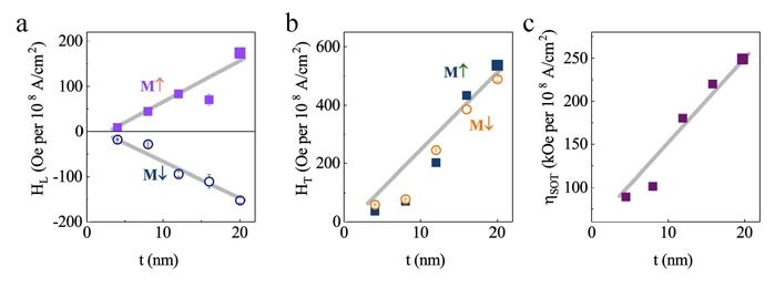 实验结果表明:L10相FePt单层中存在自旋力矩效应,可利用自旋力矩操控磁化状态(图2),并且该自旋力矩表现出体效应特性,即随着薄膜厚度增加自旋力矩增强(图3)。