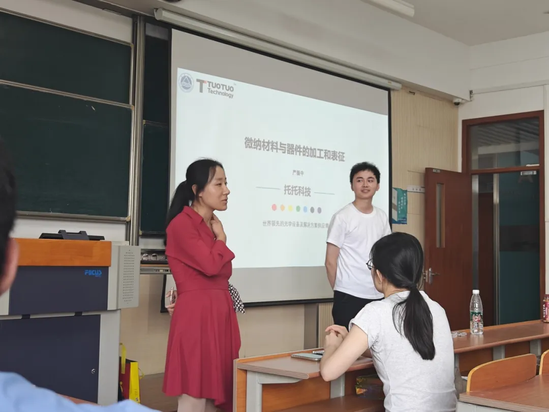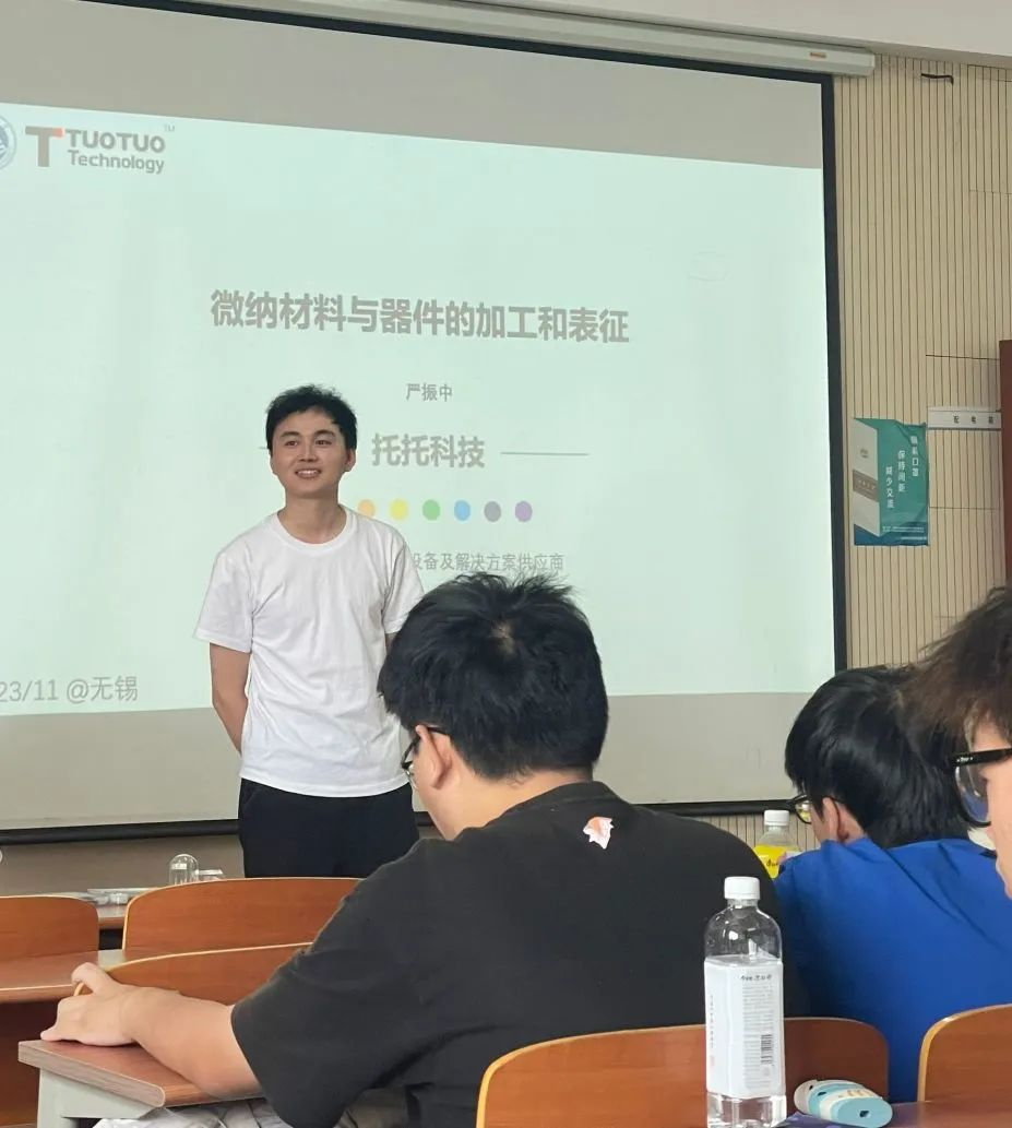托托科技的工程师严振中为江南大学微电子科学与工程大三年级的同学讲解了关于“微纳材料与期间的加工与表征”的内容,介绍了什么是光刻技术,光刻机的起源,以及各种不同类型的光刻设备的特点与优缺点,重点向同学们展示了托托科技光刻样品和3D打印样品。