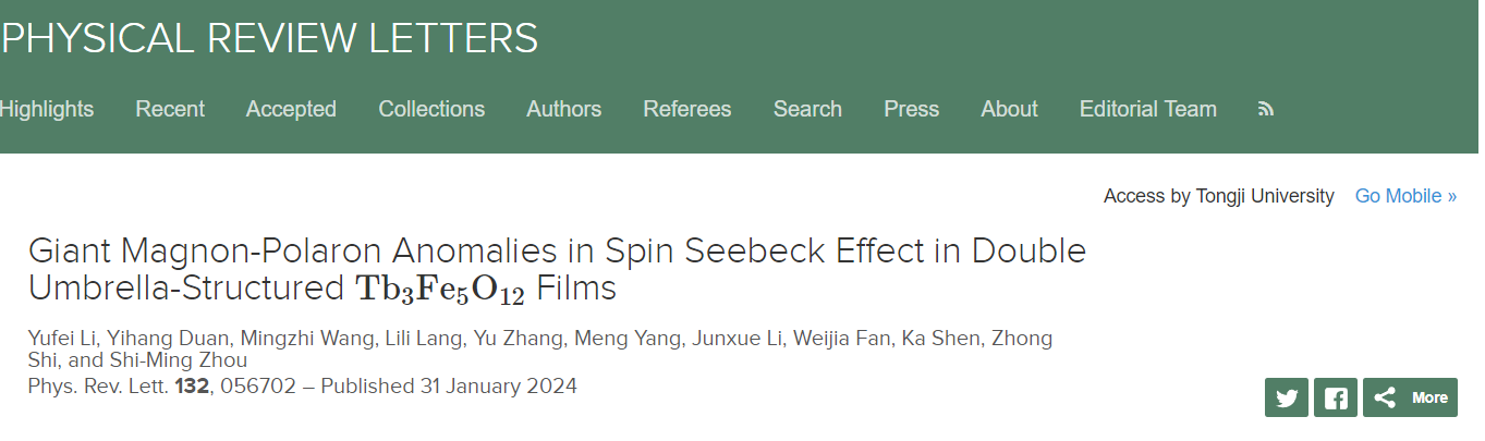 近日,同济大学物理科学与工程学院时钟教授和北京师范大学物理系沈卡教授联合在磁振子输运领域取得新进展,研究成果以“Giant Magnon-Polaron Anomalies in Spin Seebeck Effect in Double Umbrella-Structured Tb3Fe5O12 Films”为题发表在物理学领域顶级期刊《物理评论快报》(Physical Review Letters)上。