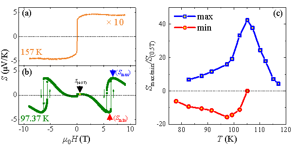 铽铁石榴石(Tb3Fe5O12, TbIG)作为一种比较特殊的稀土石榴石,其Tb亚晶格的磁矩会随着温度的降低从共线排列逐渐转变为非共线的锥形排列。在低温下,Tb与Fe亚晶格的磁矩在整体上形成了双伞态(double-umbrella)磁结构(如图1), 因而是研究磁振子激发及其与声子耦合的理想平台。本工作生长了TbIG/Pt异质结,研究了非共线-双伞态磁结构对SSE的调控作用。实验结果表明,当在TbIG [100]方向扫描磁场时,双伞态磁结构在低场下得以维持,SSE呈现低电压状态;随着磁场增大,SSE发生变号且信号显著增强,并在一个临界场突然翻转,表明磁结构存在突变。临界场附近的SSE系数相对于低场的值可增强40倍以上(如图2),远超之前在磁性材料体系中报道的数值。