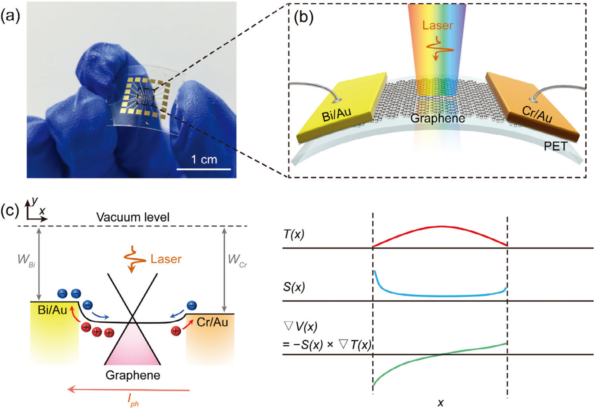 图1 柔性石墨烯探测器及其工作原理。(a)柔性石墨烯探测器实物图。(b)柔性探测器示意图,由非对称金属电极(Bi/Au和Cr/Au)组成,并以单层石墨烯作为沟道连接。(c)探测器的能带图。(d)载流子温度T(x)、塞贝克系数S(x)和电势梯度∇V(x)在探测器上的分布。