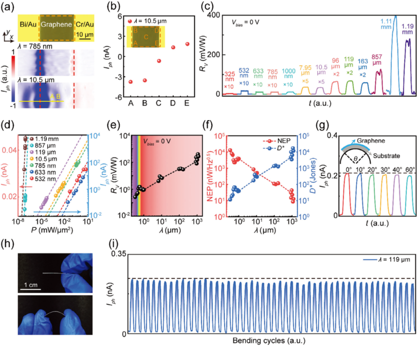 图2 柔性石墨烯探测器的光响应特性。(a)探测器的光学显微镜图(上图)、在785 nm(中图)和10.5 μm(下图)激光激发下的扫描光电流成像图。(b)探测器上五个位置的光电流分布。(c)时间分辨的宽谱光电流响应。(d)光电流与入射光功率的依赖关系曲线。(e)响应度与入射波长的依赖关系曲线。(f)NEP和D*与入射波长的依赖关系曲线。(g)不同应力下的时间分辨光电流响应。(h)柔性石墨烯探测器在自由状态和弯曲状态时的实物图。(i)器件在50个弯曲循环内的时间分辨光电流响应。