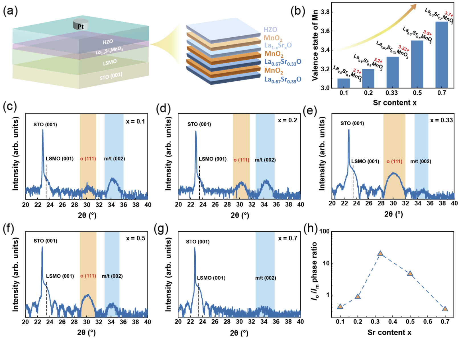 图1 HZO/La1-xSrxMnO3异质结构的 XRD 表征。(a) HZO/La1-xSrxMnO3 异质结构示意图。 (b) HZO/La1-xSrxMnO3异质结构中Mn 的价态与 Sr 含量 x 的关系。HZO/La1-xSrxMnO3异质结构的 XRD 表征的 ω-2θ 扫描 (c) x = 0.1,(d) x = 0.2,(e) x = 0.33,(f) x = 0.5, (g) x = 0.7。“o”、“m” 、“t”分别表示正交、单斜和四方相 HZO。(h) 不同异质结构的o/m 相强度比值。