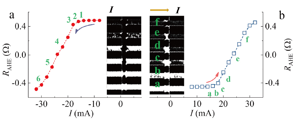 (b)a,b,c…f表示正向电流不断增加直至磁畴翻转。其中顶层Pt厚度为2.5 nm。