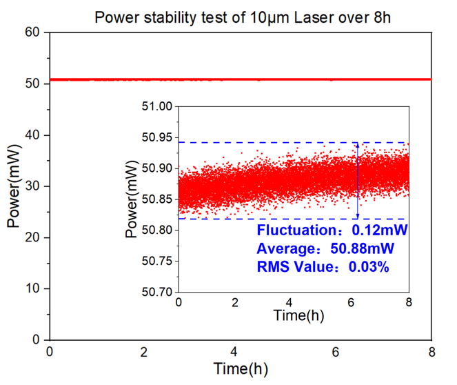 托托科技中红外激光器模组配备了优秀的温控模块,能够实现长时间高功率高稳定性的中红外激光输出,8 h长时间满功率输出,所有波长RMS稳定性优于0.1%。