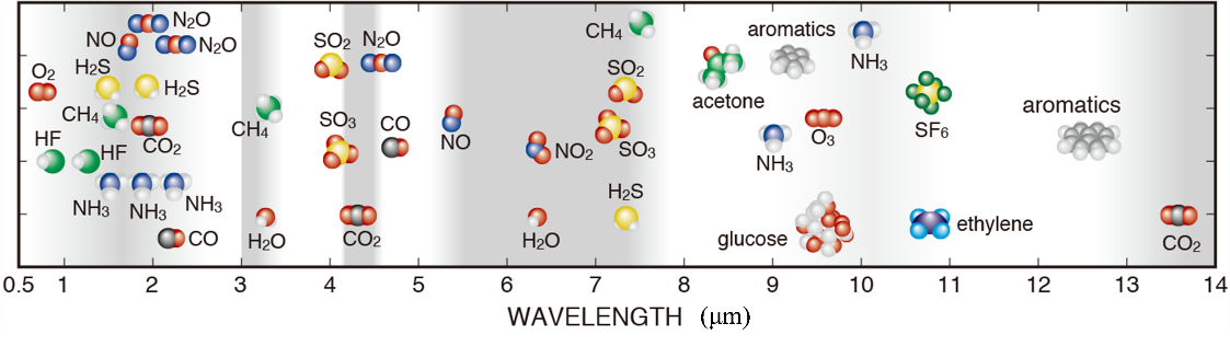 托托科技中红外激光器配备了完整的上位机控制软件,包含激光开合、功率控制、频率调制、指引光开合,软件操作界面简洁友好,用户可以轻松掌握。 托托科技中红外激光器的应用应用于气体检测 中远红外波段包含了两个重要的大气窗口3 μm-5 μm和8 μm-13 μm波段,很多气体的特征吸收峰都在这个波段,如NO、CO、CO2、NH3、SO2、SO3等(图3所示),还有一些与糖尿病、哮喘等人体疾病相关的特征气体的吸收谱线也处于此波段,因此通过中红外激光器对气体分子进行检测研究,有望实现对环境中污染气体及温室气体的监测以及临床上相关病症的早期无损筛查。