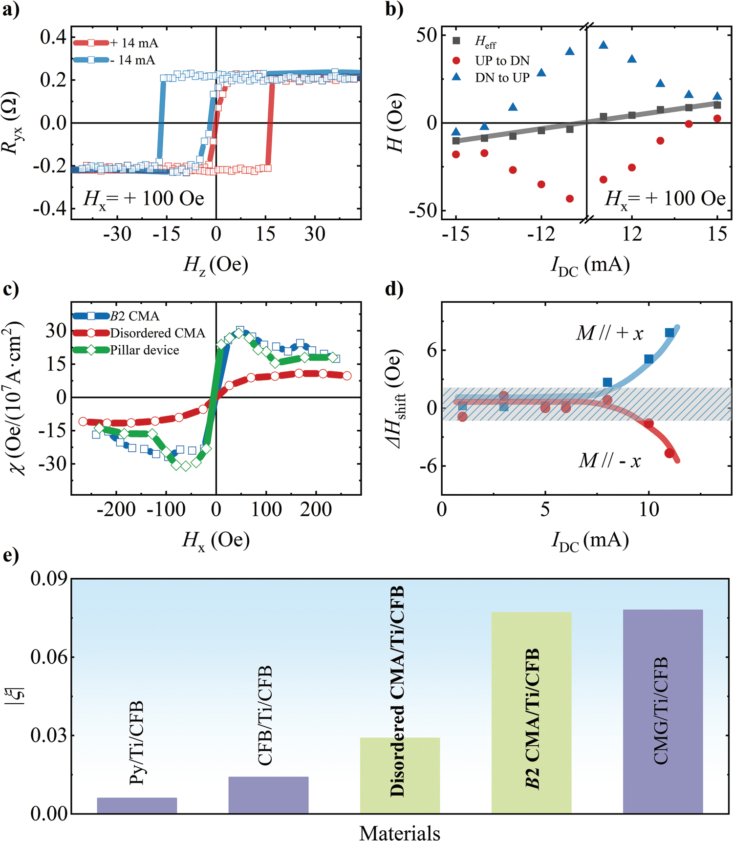 同济大学物理科学与工程学院磁性薄膜研究团队在Ti/CoFeB/MgO多层膜结构中利用CMA产生的自旋流,成功实现了具有垂直磁各向异性CoFeB薄膜的电致磁化翻转。特别地,即使在无外加磁场的条件下,仍然观测到磁化翻转现象。这表明CMA能产生具有面外极化的自旋流,其来源可归因于铁磁体的固有反常自旋霍尔效应。其次,通过优化器件结构,将Hall bar中间区域制备为圆柱体,显著减弱了大电流测量中的边缘效应,从而将磁化翻转比例大幅提升至90%。这一优化为电致磁化翻转测量提供了新的设计思路。最后,该工作利用反常霍尔回线偏移表征了CMA的ξ。研究发现,相比于无序结构的CMA,有序CMA中具有更大的ξ。这一结果表明,晶体结构的有序性对于增强自旋流至关重要,为设计高性能自旋电子材料提供了重要指导。