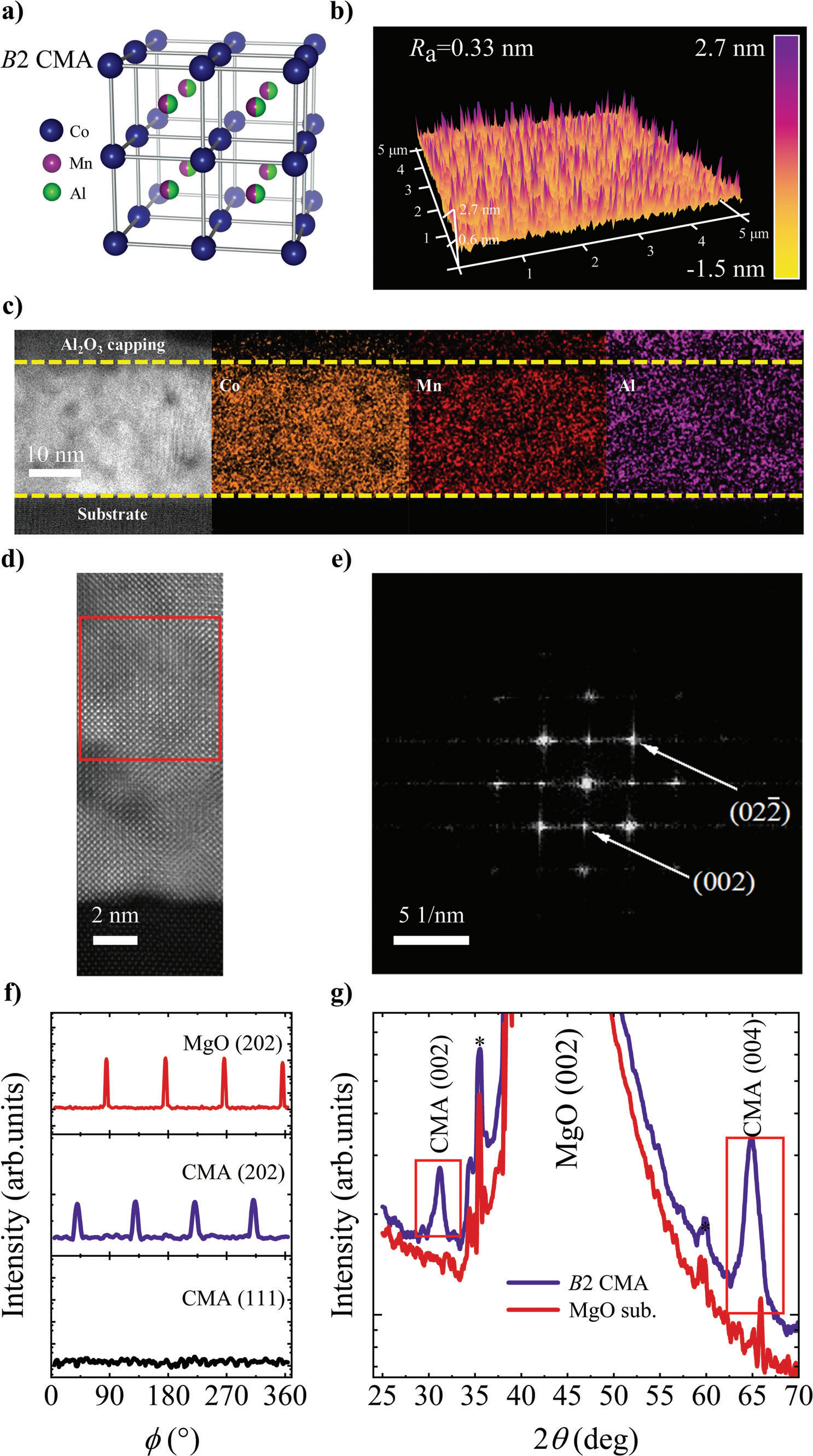 在自旋输运中,自旋霍尔效率(ξ)是衡量自旋输运中材料的电子-自旋转化能力大小的关键参数,其数值越大,材料产生自旋流的能力越高效。因此具有较高ξ的材料在自旋轨道力矩 (SOT) 器件中具有重要应用价值。哈斯勒合金作为一类三元金属间化合物,因其元素可替换性、结构可调控性及物性与结构紧密相关的特点,在物理科学和材料科学领域备受关注。此前研究表明,Co2MnAl(CMA)作为一种外尔半金属,具有拓扑能带特性,可增强本征反常霍尔效应与反常能斯特效应,为研究其自旋输运特性提供了基础。然而,CMA的强自旋输运性质尚未得到系统实验验证。