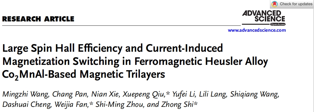近日,同济大学物理科学与工程学院磁性薄膜研究团队在铁磁性哈斯勒合金的自旋流产生机制研究中取得重要进展,研究成果以“Large Spin Hall Efficiency and Current-Induced Magnetization Switching in Ferromagnetic Heusler Alloy Co2MnAl-Based Magnetic Trilayers”为题,发表于《先进科学》(Advanced Science)。