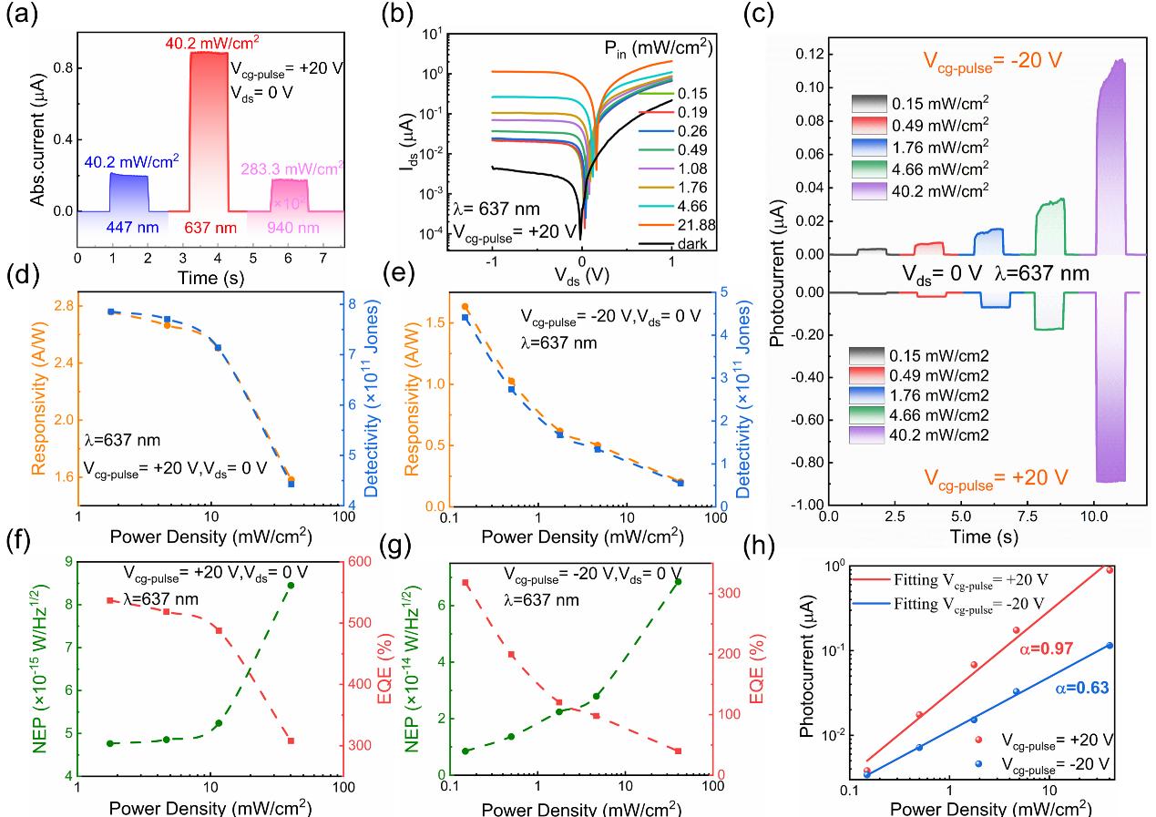 图2. WSe2 SFG-PD器件的可重构光伏特性。a) 在不同工作波长下,WSe2 SFG-PD器件的可切换光电响应测试。b) WSe2 SFG-PD器件半对数光输出曲线。c) WSe2 SFG-PD器件可逆光响应测试。d,e) 在Vcg脉冲为±20 V器件自驱动的响应率(R)和比探测率(D*)。f,g) 在Vcg脉冲为±20 V器件的噪声等效功率(NEP)和外量子效率(EQE)。h) 在Vcg脉冲为±20 V、0 V偏压和637 nm波长下,器件光电流与光强之间的拟合关系。