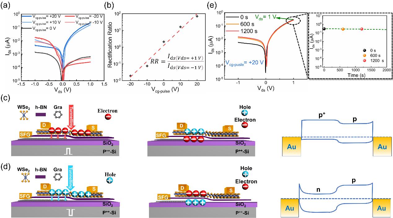 图1. 在WSe2/h-BN/Gra异质结中实现非易失性p+-p/n-p结。a) 在不同栅压脉冲下,WSe2的半对数坐标IDS-VDS曲线。b) WSe2在不同栅压脉冲下的整流比。c) WSe2 SFG-PD器件在施加并释放正Vcg至Si控制栅条件下的工作示意图。d) WSe2 SFG-PD器件在施加并释放负Vcg至Si控制栅条件下的工作示意图。e) 在施加+20 V栅压脉冲下,WSe2的时间依赖半对数IDS-VDS曲线。