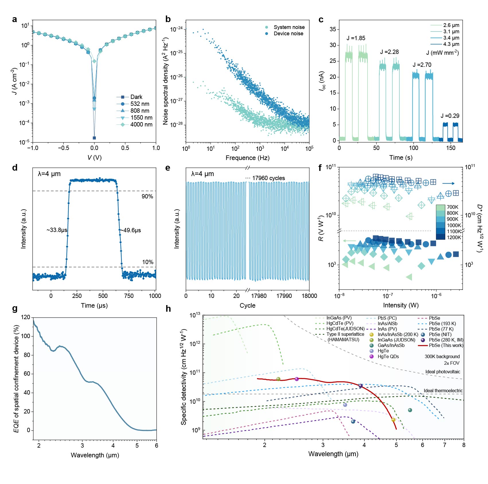 图3. 空间限阈PbSe探测器的电学性能及中波红外(MWIR)响应特性。(a)非对称PbSe器件的Jds-Vds曲线。(b)PbSe器件及测量系统的噪声谱。(c)不同波长光照射下PbSe器件的光电流响应。(d)4 μm激光照射下的响应速度。(e)PbSe器件的稳定性。(f)黑体探测的响应率和比探测率与功率强度的依赖。(g)室温下空间限阈器件的EQE。(h)空间限阈的PbSe探测器与传统光电探测器比较。