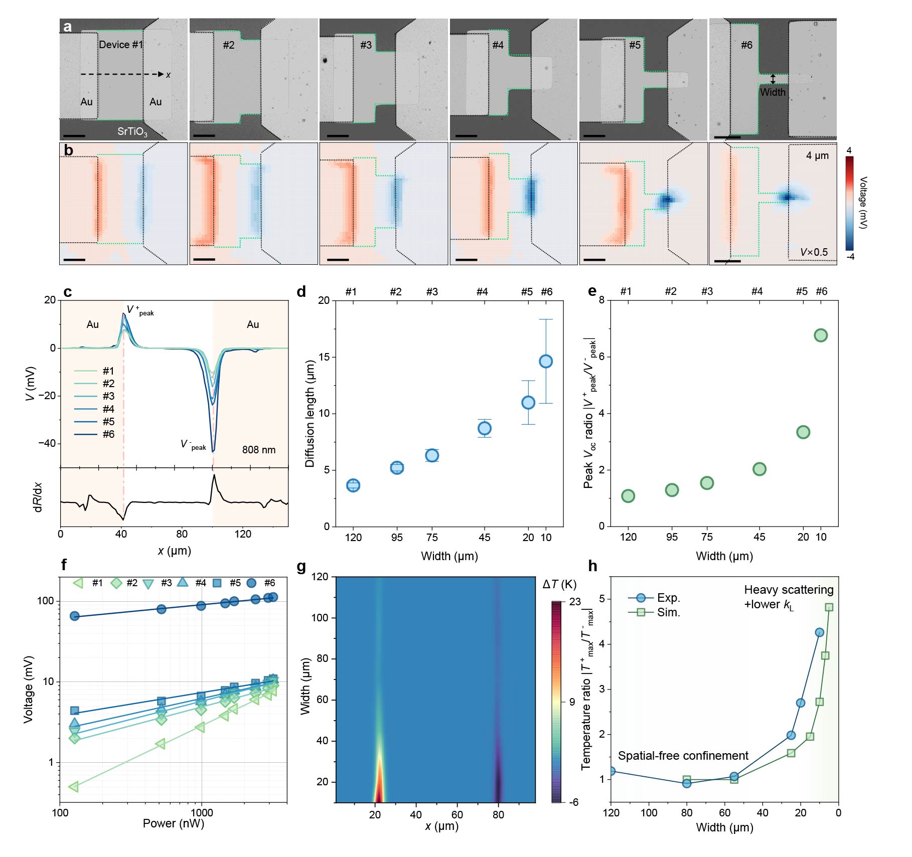 图2. 空间限阈增强的光电热电电压。(a)宽度为10~120 μm的PbSe器件的SEM图像。(b)扫描PbSe器件的光电压图像。(c)聚焦808 nm光的光电压线性扫描。(d)和(e)为扩散长度和器件的峰值Voc比值作与通道宽度的函数。(f)4 μm激光照射下的光电压与输入功率的关系。(g)激光导致温度升高的扫描图。(h)PbSe器件温度比(T+max/T-max)的实验值和模拟值。