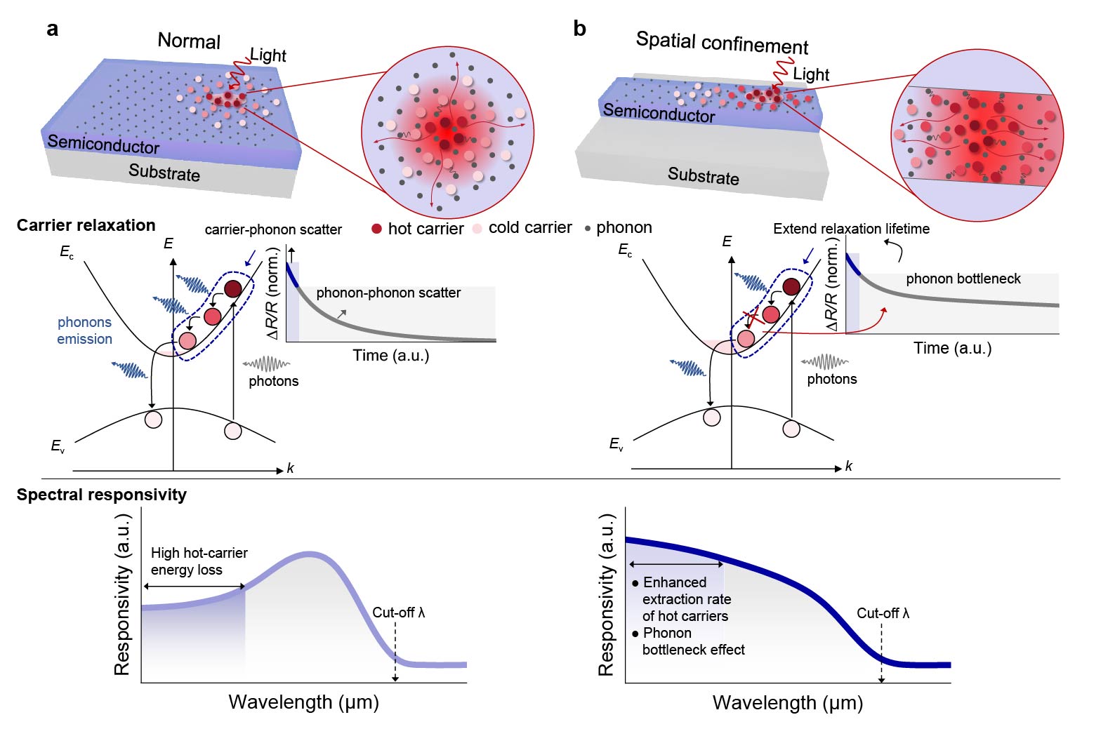图1. 半导体中空间受限的热载流子动力学。(a)在半导体的光电器件中,传统光激发热载流子的冷却过程。(b)空间限阈结构放大了局部声子瓶颈效应,延长了载流子扩散寿命。